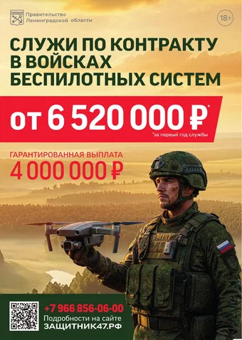Ленобласть увеличила до 4 млн рублей гарантированную выплату гражданам, заключившим контракт в Ленинградской области для поступления на военную службу в Войска беспилотных систем ВС РФ.